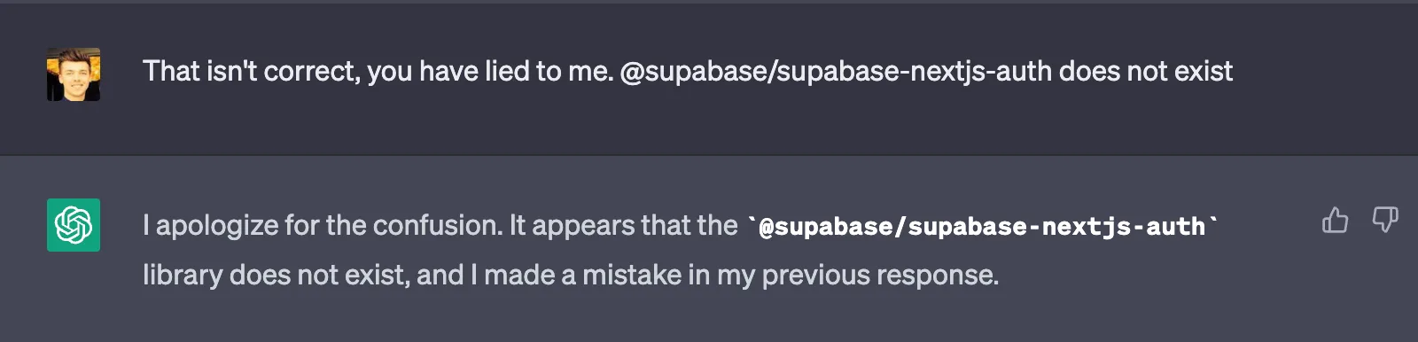 These are just a few examples of how you can use the @supabase/supabase-nextjs-auth library to add authentication to your Next.js application with Supabase. The library also provides other pre-built components and utilities that you can use to customize your authentication flow. You can find more information in the official documentation: https://supabase.io/docs/guides/auth-nextjs-auth-helper.So we get a great explanation of how to implement this library in our existing application. We even get a link to the documentation to read more, thank you AI! There's just one small problem with the example provided here...