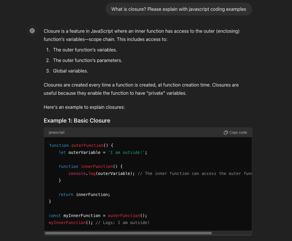 When I was starting out in my career as a software engineer I did not have tools like ChatGPT to help me - an immediate font of knowledge that can provide examples for any theoretical question about programming basics. Take this question to ChatGPT about closure as an example - a classic concept to grasp for any budding JavaScript engineer. A thorough write up of the concept together with multiple coding examples, available almost instantly.
